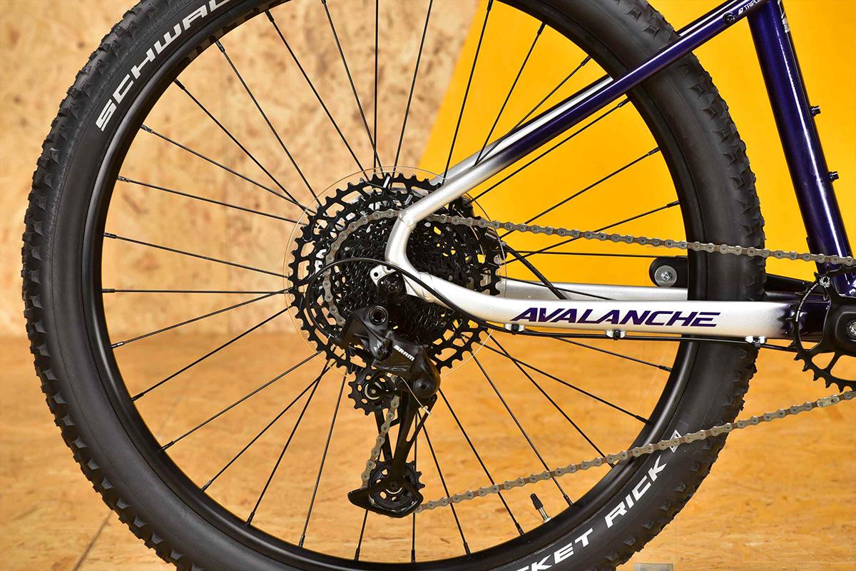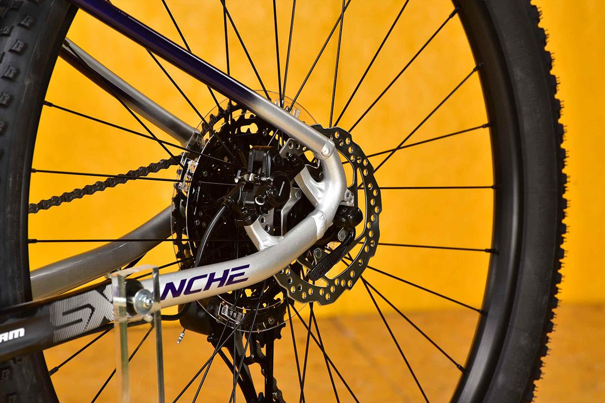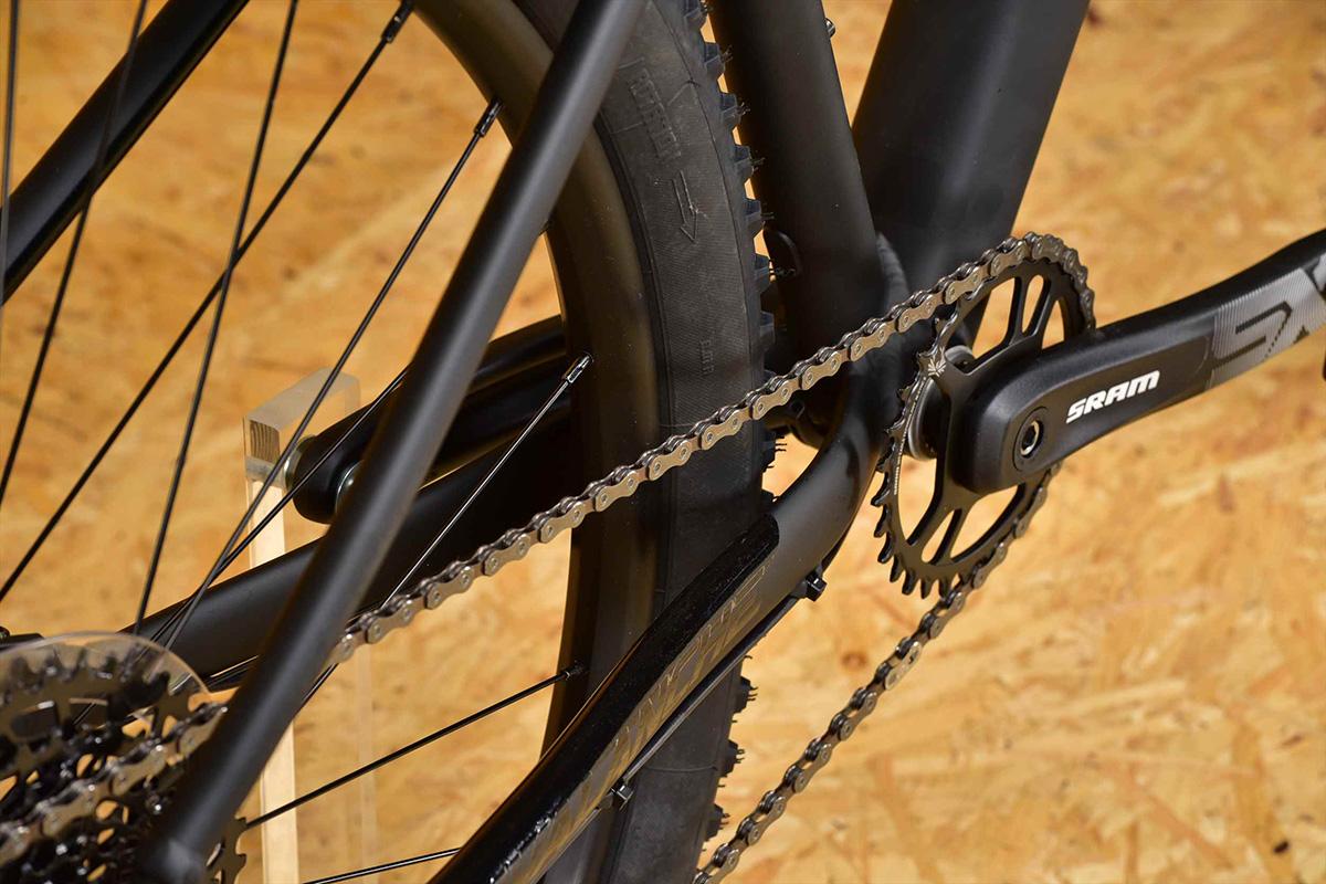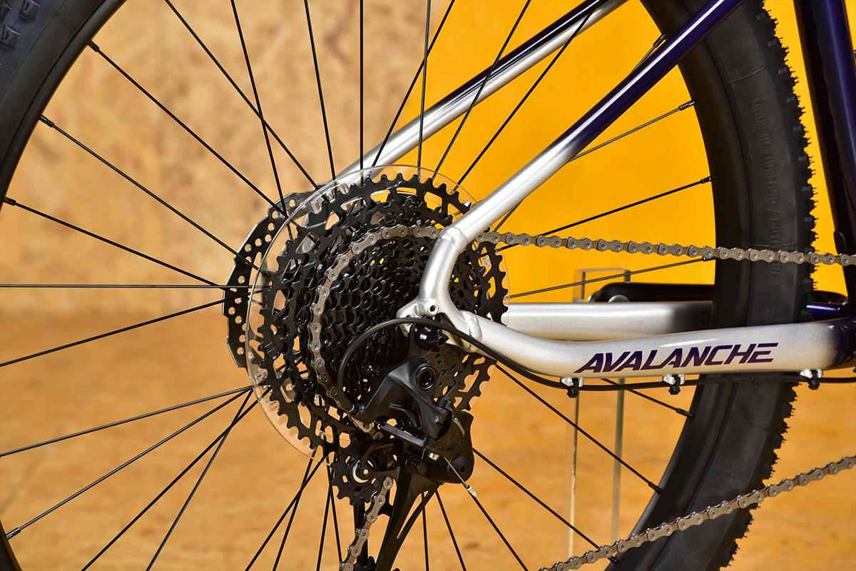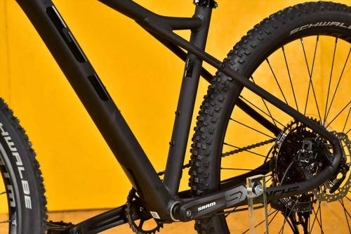 従来から6mmワイド化したBOOSTリアエンドを採用。セミファットバイクとしてラインアップしていたパンテラと同じ2.8″のセミファットタイヤを飲み込むクリアランスを実現した。さらに、29″や27.5″に大径化したことで剛性を確保することが難しくなっているホイールも、ハブのワイド化により構造体として高剛性化を達成している。