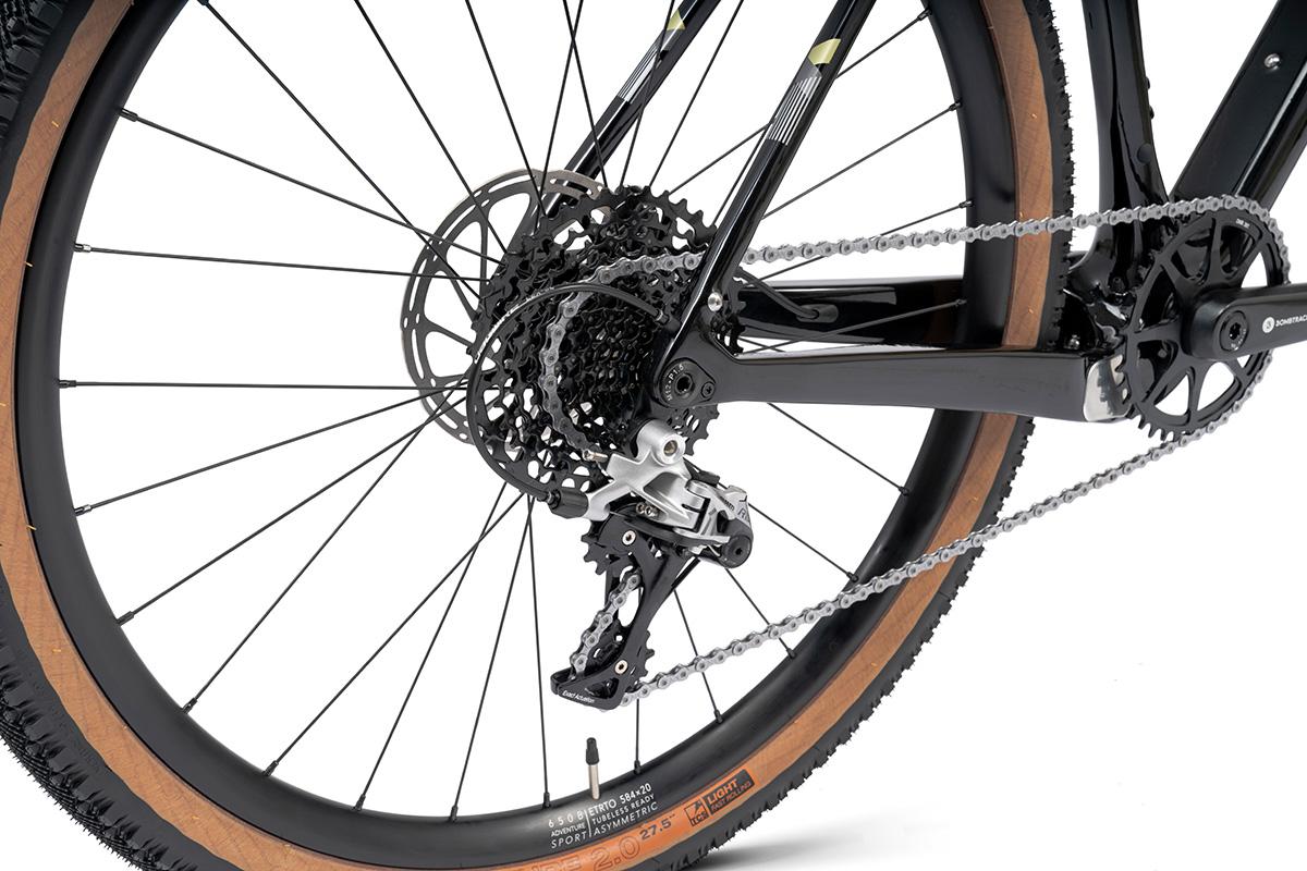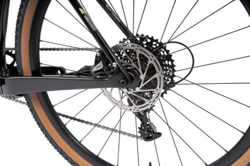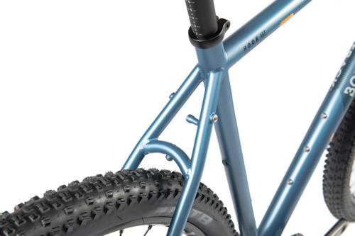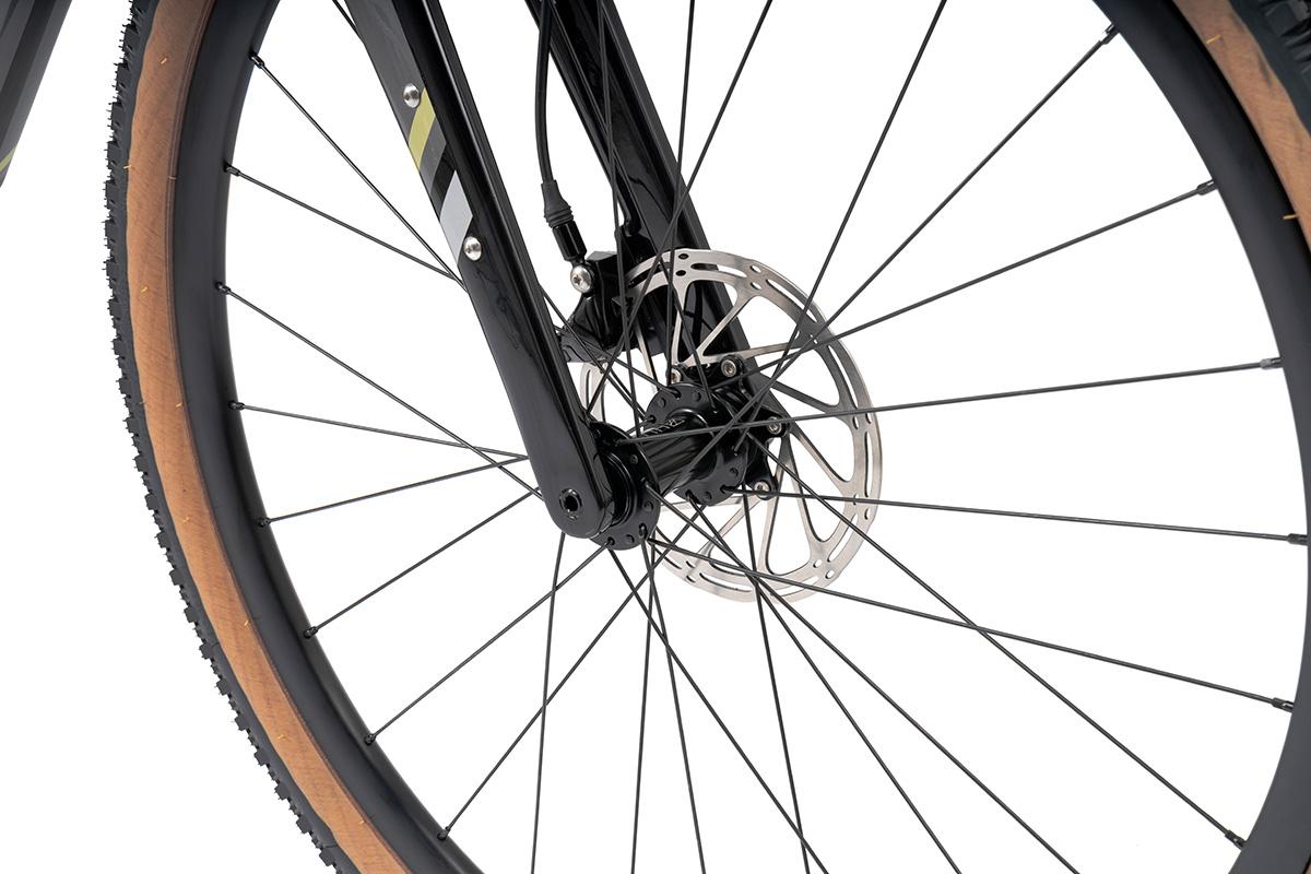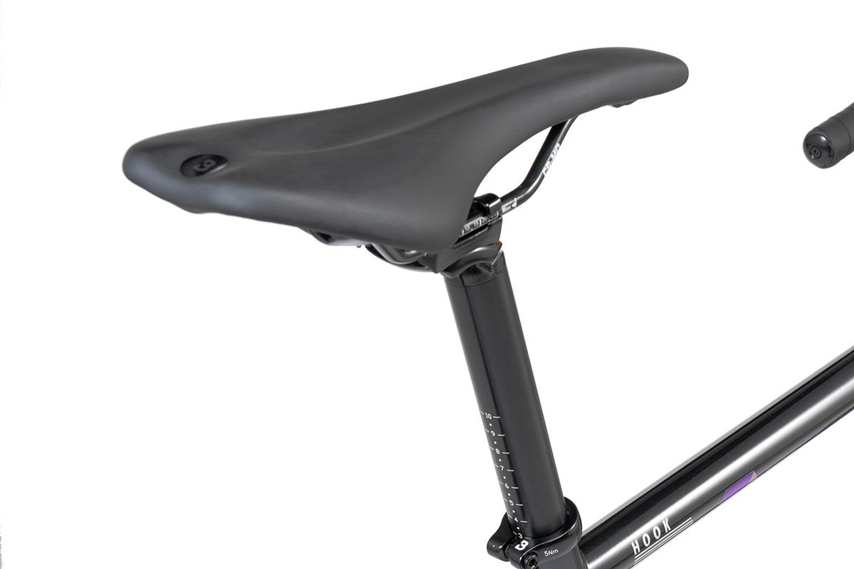 HOOKにはMTBに匹敵する極太タイヤが装着可能なクリアランスを確保している。太いタイヤはエアボリュームが大きく、路面の追従性に優れるとともにパンクのリスクも低い。アドベンチャーライドに向いていると共に、舗装路、特に下り坂では絶大な安心感を提供する。(最大対応タイヤ幅はビルドインフォ参照) |