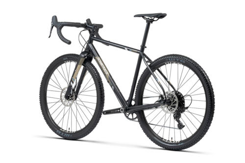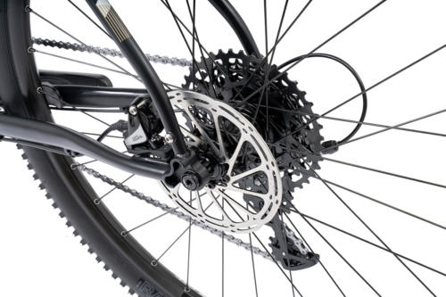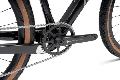 HOOK EXT Cには、最新スポーツバイクの標準ともいえる、ハイモジュラス(高密度)カーボンを用いたフレームを採用した。ロードレースにおいてはそれまでの主流であったアルミフレームをあっという間に駆逐したカーボンは、振動吸収優れ、その上軽量だ。広いタイヤクリアランスと最大46Tシングルギヤまで許容する独特のチェーンステー形状を採用。シルエットのインパクトにも貢献している。 |