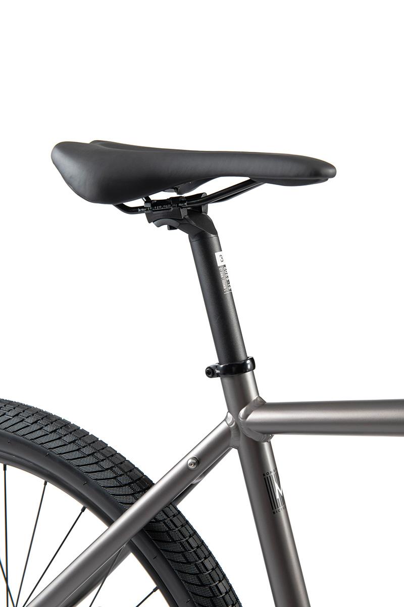 45Cの幅広タイヤを650Bホイールに組み合わせている。舗装路が中心のシティライドでは、幅広タイヤの持つ重量が慣性を生むことでライダーの体力を節約させられる局面も多くある。さらにアスファルトの切れ目、クレーチング、路肩の境界などロングライダーの天敵にも安心感を持って対応できる。 |