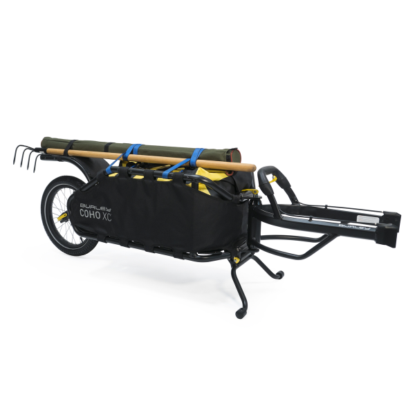 キックスタンドを装備し、トレーラーだけでなくスタンドのない自転車も自立させられる。