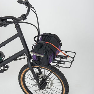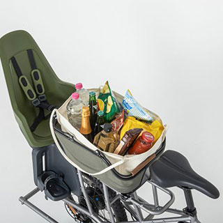 • 下部のサポートフレームを合わせたキャリアサイズは前後80cm×幅60cm。上部のキャリアのみだと幅16cm。キャリア部分はフレームにネジ止めされているタイプと違い、フレームに溶接されてフレームの一部となっているため非常に丈夫です。80キロまでの荷物を載せることができます。上部のパイプは17ミリの太さとなっており、安心してチャイルドシートを取りつけることができます。