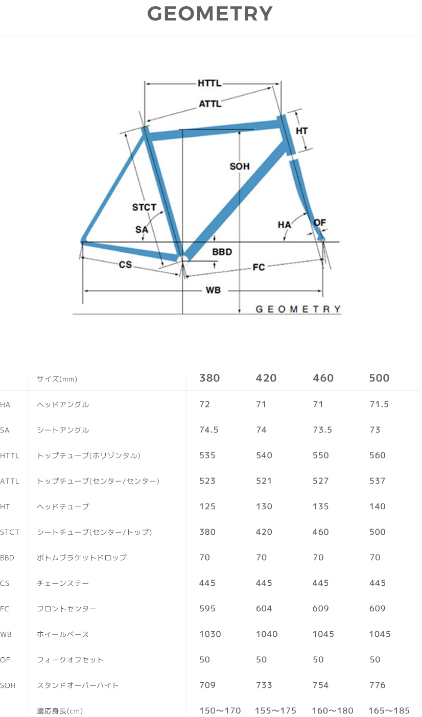 | 適応身長 | 380(150〜170 cm) 420(155〜175 cm) 460(160〜180 cm) 500(165〜185 cm) |