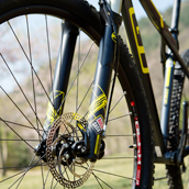 | GTのアイデンティティとも言える、シート根元の形状『トリプル・トライアングル』。かちっとした乗り味とGTらしさを同時に提供。 | フロントサスのトラベル量は100mm、29erホイールの走破性とベストマッチ。このカラーリングが黄色&黒になっているのも好印象だ。 | 全体のカラートーンを統一するのが、今年のGTの大きな特徴。このザスカーでは黄色と黒。グリップにも『GTウィング』が描かれる。 | ||||