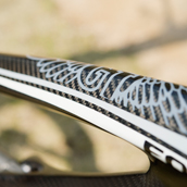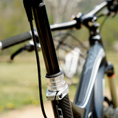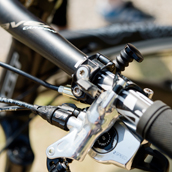 | ロックショックスの可変シートポスト、リバーブを装備する。上りも下りも自在に楽しめるこの装備は、最近のMTBのマストアイテム。 | ハンドル部、左右にレバーが付く。サスの動きと可変シートポストの長さを制御するスイッチだ。まるでコックピットのようである。 | カーボンの素地の上に描かれるグラフィック。全体のトーンをブラック&カーボンでまとめあげた、シブいルックスのモデルだ。 | ||||