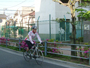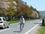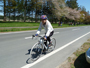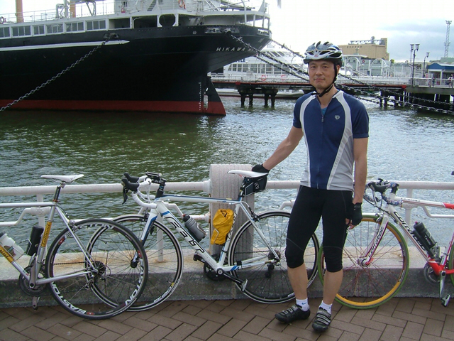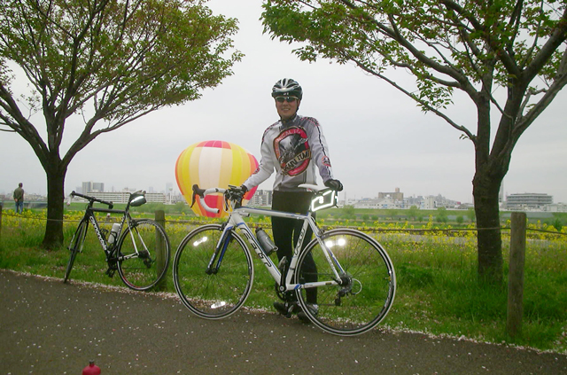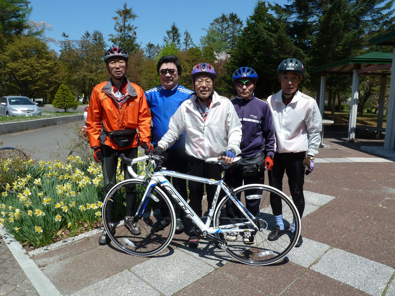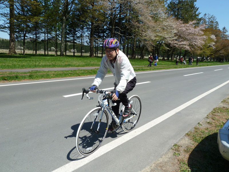 試乗した場所が静内さくらまつりの会場の二十間道路の高台ということもあり横風が非常に強く時々あおられる始末ででした。でもこぎだしは軽く上々、一昔前の105とは違い一味も二味もグレードアップしていると思われます。これもコンパクロドライブのおかげだと思います。変速もパアーンパアーンと小気味よく入り風も気にならない。走行時の振動も吸収してくれ、後からの車に気にしつつスラロームを軽くやるとハンドルの切れも良し。青のニップルが太陽に反射しこれまたナイスだア!! ただ、バルブアダプターを付いていないのが残念!!