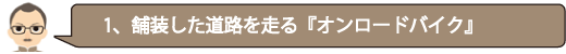 | 1、舗装した道路を走る『オンロードバイク』 2、野山を走る『オフロードバイク』 3、アメリカで発達した『BMXバイク』 4、アメリカで誕生した『ビーチクルーザー』 これらの種類の更なる詳細を説明しよう! |