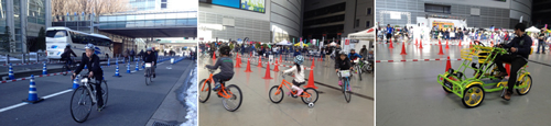 道路を封鎖しての試乗コース(15日は雪で中止、16日は後半強風で中止)。子供車は大人気。こんな変わり種自転車も
