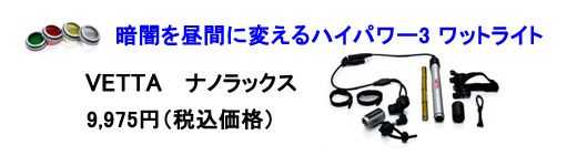 暗闇を昼間に変えてしまう強力ライト、VETTAのナノラックスのご紹介。取り付けに必要なすべてがそろうのでとってもお得で簡単です。・・・・・続きはタイトルをクリック! ">