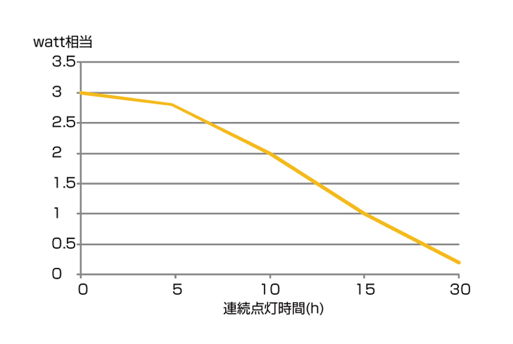 長時間照度を維持 5 時間前後まで強力な明るさを維持。 その後も十分な明るさを10 時間以上 保ち続けます。 明るいライトを装備するならNanolux!