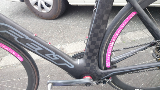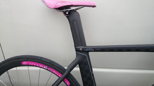 | AR FRDの特徴の一つとして「シートポスト」があり、前後を入れ替えることができる。写真のようなロードポジションであれば72.5度、逆に付け替えれば78.5度になる。ドラフティングレースだけでなく、ミドルやロングも出るトライアスリートはバイクを2台以上持つか、もしくはロードバイクにDHバーを装着して渋々?ロングのレースを走るしかなかった。 しかしAR FRDであればシートポストの向きを入れ替えるだけで簡単にロード、TTポジションに変更することができ、1台で2役をこなしてしまう。 2台購入することを考えれば、非常に高いコストパフォーマンスを発揮していると言える。 また、カラーリングはシックなマットブラックなので、バーテープやサドルなどのパーツを変えればいろいろなカラーのバイクを楽しむことができる。「世界に1台の自分バイク」を作り上げるのも面白いだろう。 | |||