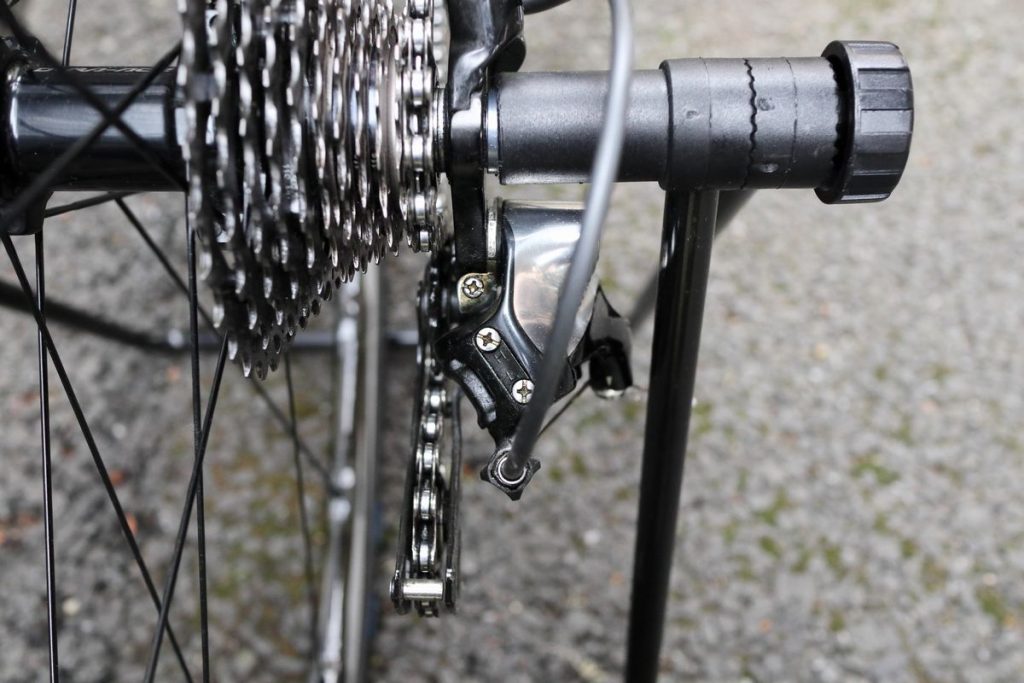 今度は、リアディレイラーにあるワイヤーテンション調整ボルトを反時計方向に回して、現在の位置から1段大きいギア(トップギアから数えて3段目)と接触せずに音鳴りが発生しない位置に調整します。