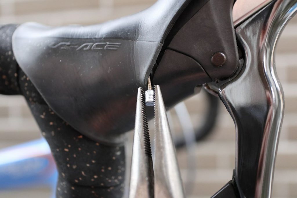 リア側シフトワイヤーの先端に付いたワイヤーキャップをペンチで外します。