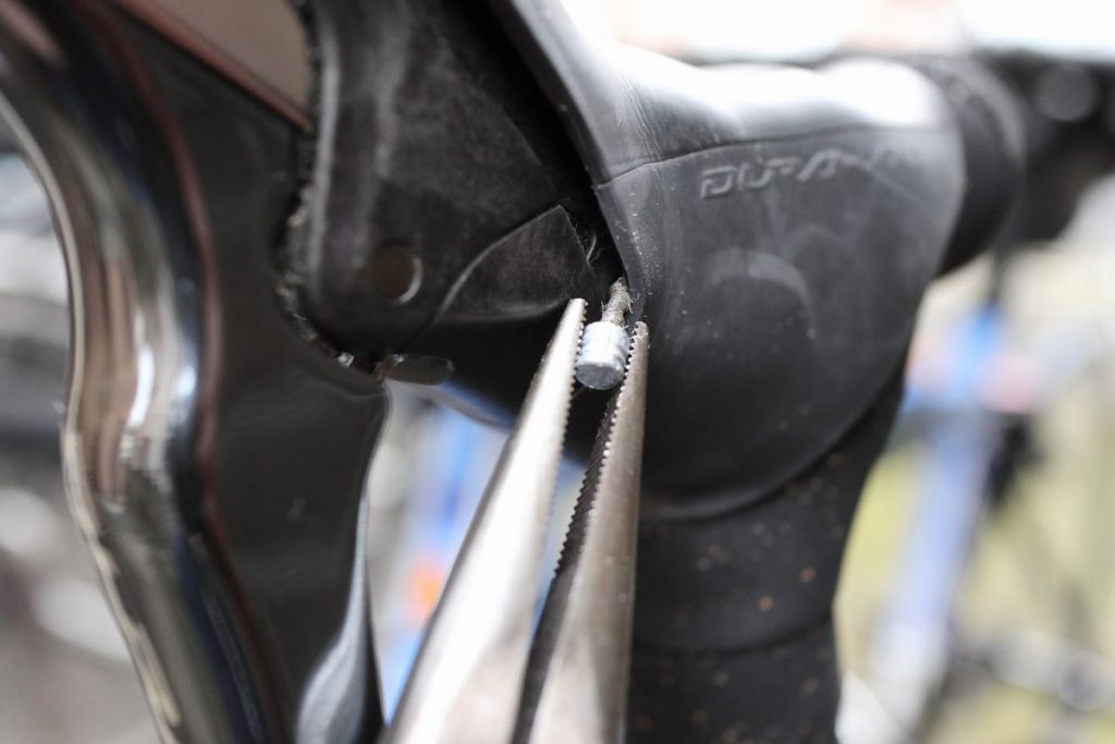 (3)リア側シフターからリア側シフトワイヤーをラジオペンチで抜き取る。