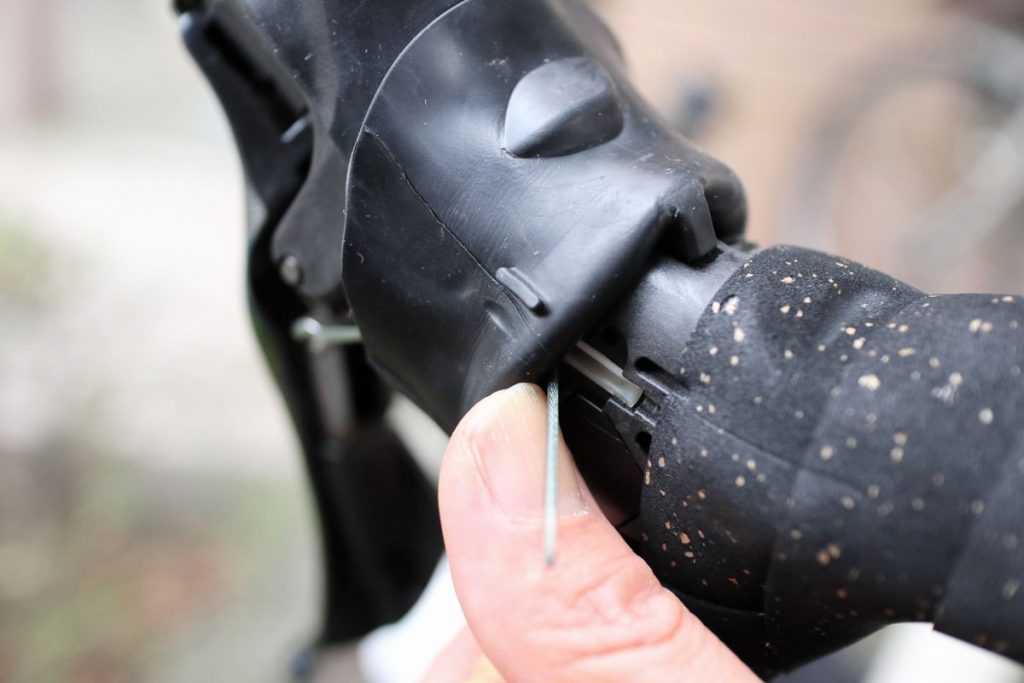 新しいシフトワイヤーの向きを90度変えて、バーテープ内部に隠れたアウターワイヤーの中に差し込んでいきます。