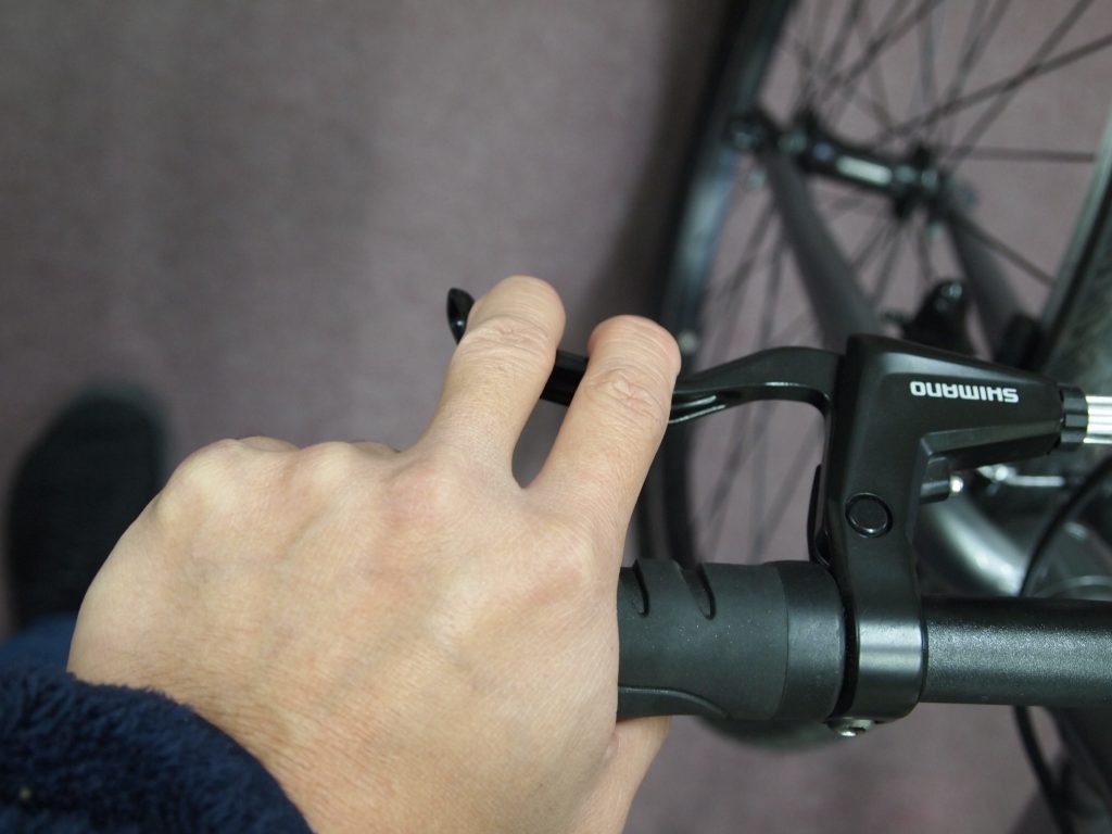 下の写真のようにブレーキレバーに指を当てたときに第一関節よりも先にレバーが来ている場合は要注意。