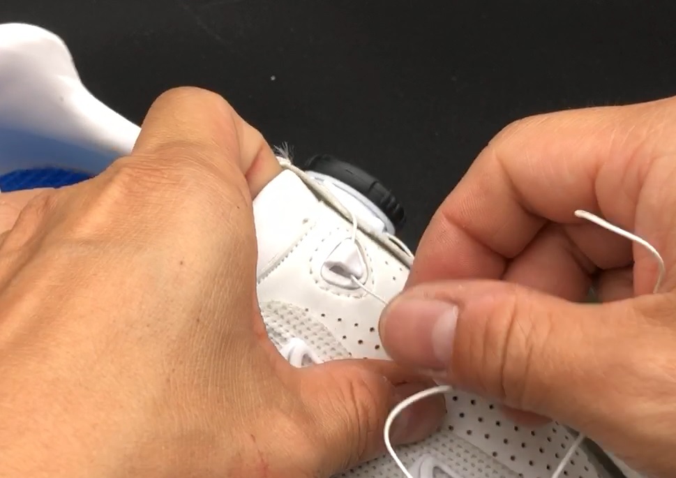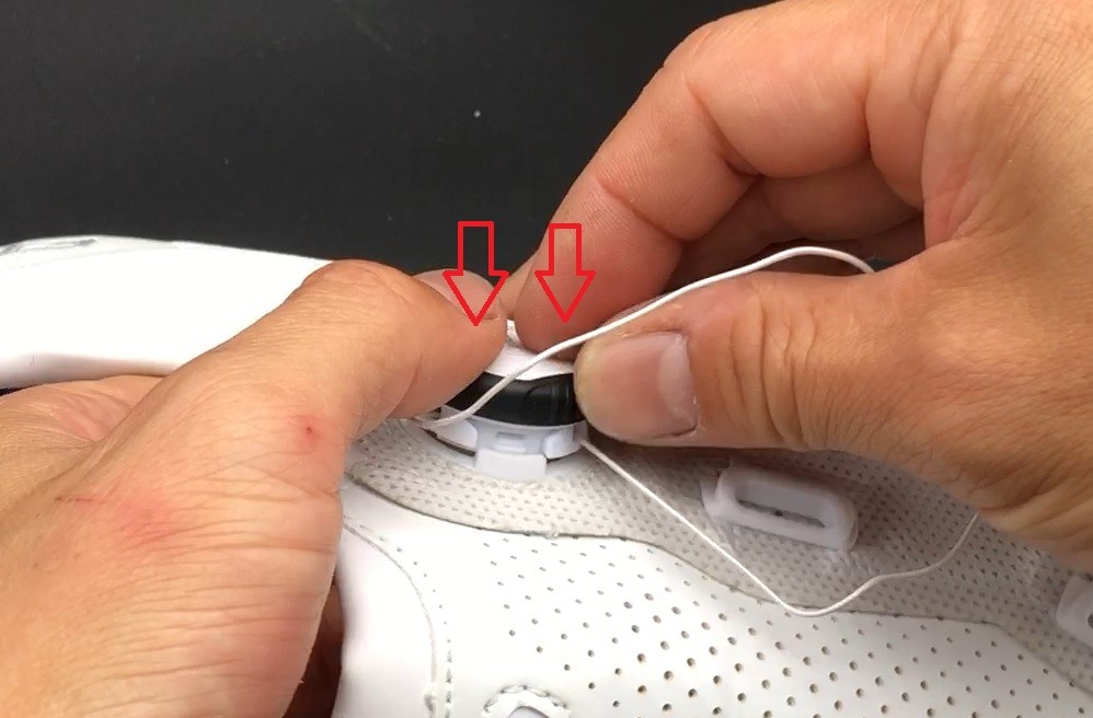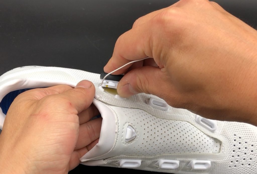 取り付けは外すときよりもコツが要ります。シューレースをガイド両端で持ち、滑り込ませていきます。