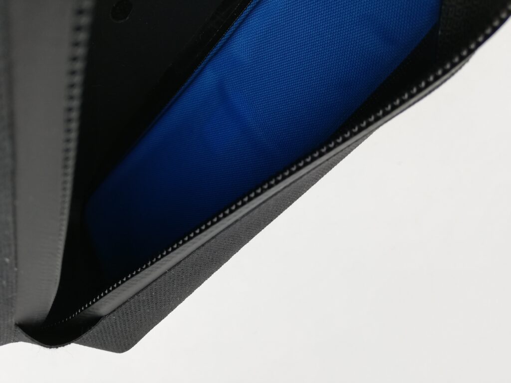防水素材に、縫い目が無い接着構造、止水ジッパーなのは安心感があります。もちろん本格的な雨に降られてしまったらどうしてもジッパー部分の隙間から水は侵入するので、中身が全く濡れないということは無いと思いますが、泥や砂が染み込む心配は少ないですし、やっぱり防水に越したことはないですね。