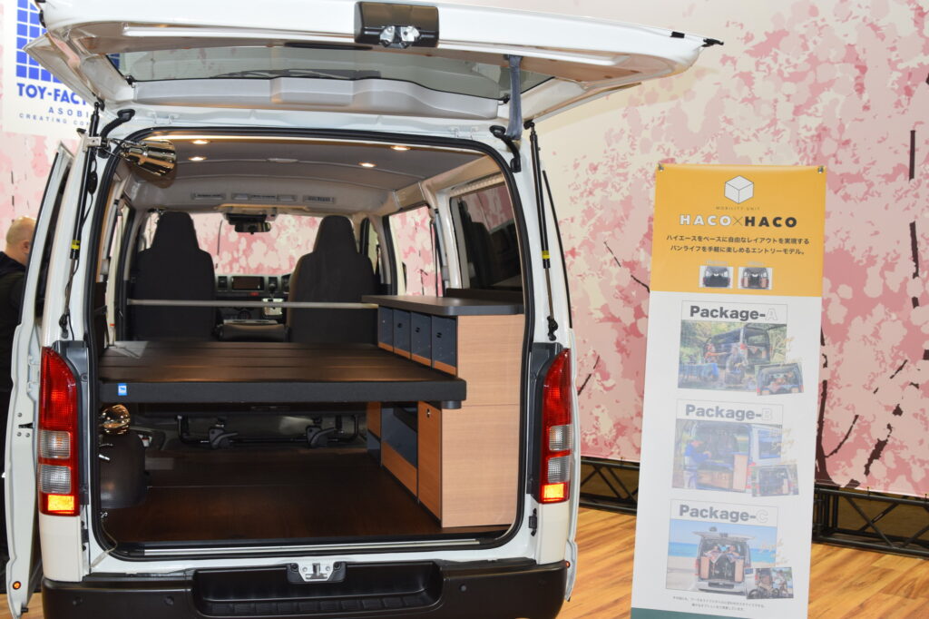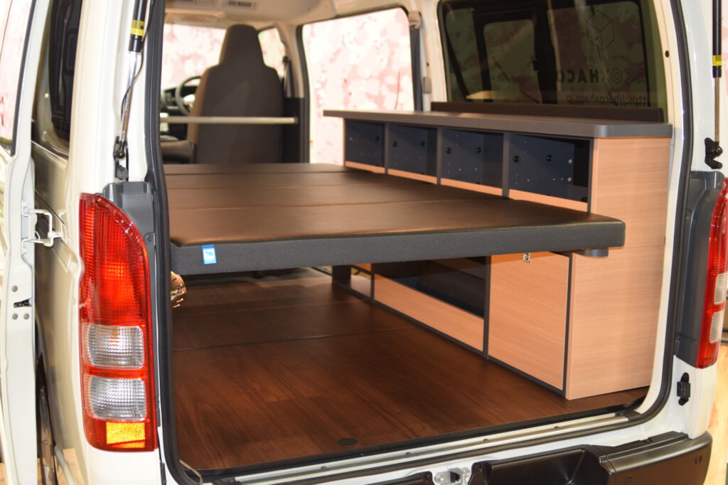 キャンピングカーまで必要はないけれど、収納や車中泊スペースが欲しい場合に便利な、後付け可能なHAKO×HAKOというハイエースカスタム用ユニットシェルフもお取扱いされているそうです。