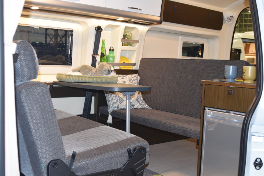 ブース内にはこのキャンピングカーショーで正規輸入車として国内初となるイタリアのフィアット社の「デュカト」をベースにしたキャンピングカーが4台公開されていました。欧州車らしい洗練されたデザイン、高い車高を活かした広いスペースに、モダンなインテリア。見るだけでもワクワクします。運転席、助手席を回転させることが出来て、駐車時はリビングのように使うことも可能だそうです。