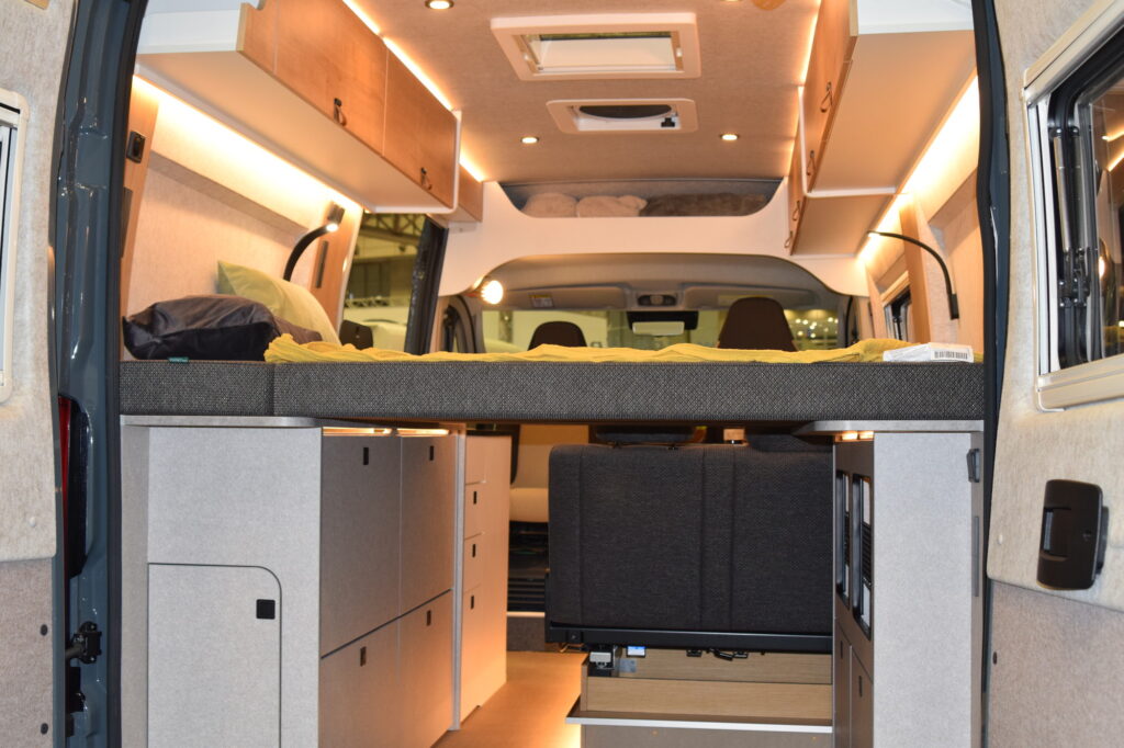 しかし、荷物積載専用の使い方とはガラッと違って、こちらで展示されているたくさんのキャンピングカーは外観は普通のハイエースでも、お洒落なリビングルームのような内装や充実した装備が目を惹きます。