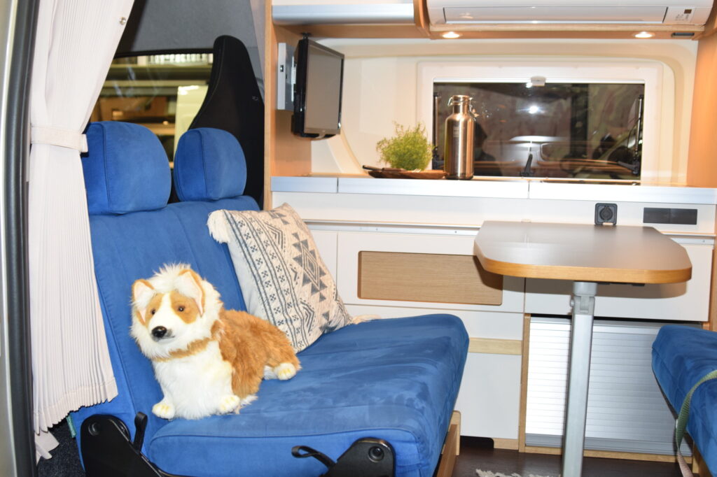 会場に展示されていたウィズドッグ仕様のモデルを見せて頂きました。ブルーのシートが目を惹きますが、この色は犬が視認しやすいので選ばれたそうです。シートに使われているプレミアムスエード生地は引っ掻きに強く、手触りもよくお手入れが簡単。寒暖差に弱い犬種も多いので、エンジン停止中でも作動するエアコンを設置し、車体にはトリプル断熱を採用。こうした様々な工夫が施され、ペットのための理想的な空間になっています!