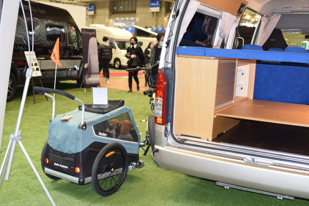 この会場もペット連れの方が多いですが(会場内はペットケア料金を払えばペットの入場も可能)こういったキャンピングカー市場では「ペットと一緒に旅をする」という方の割合が非常に多いです。もちろんペットと泊まれる宿等もありますが、どうしても数が少なく、不慣れな場所ですし、気軽に行くことはなかなか難しいのではないでしょうか。