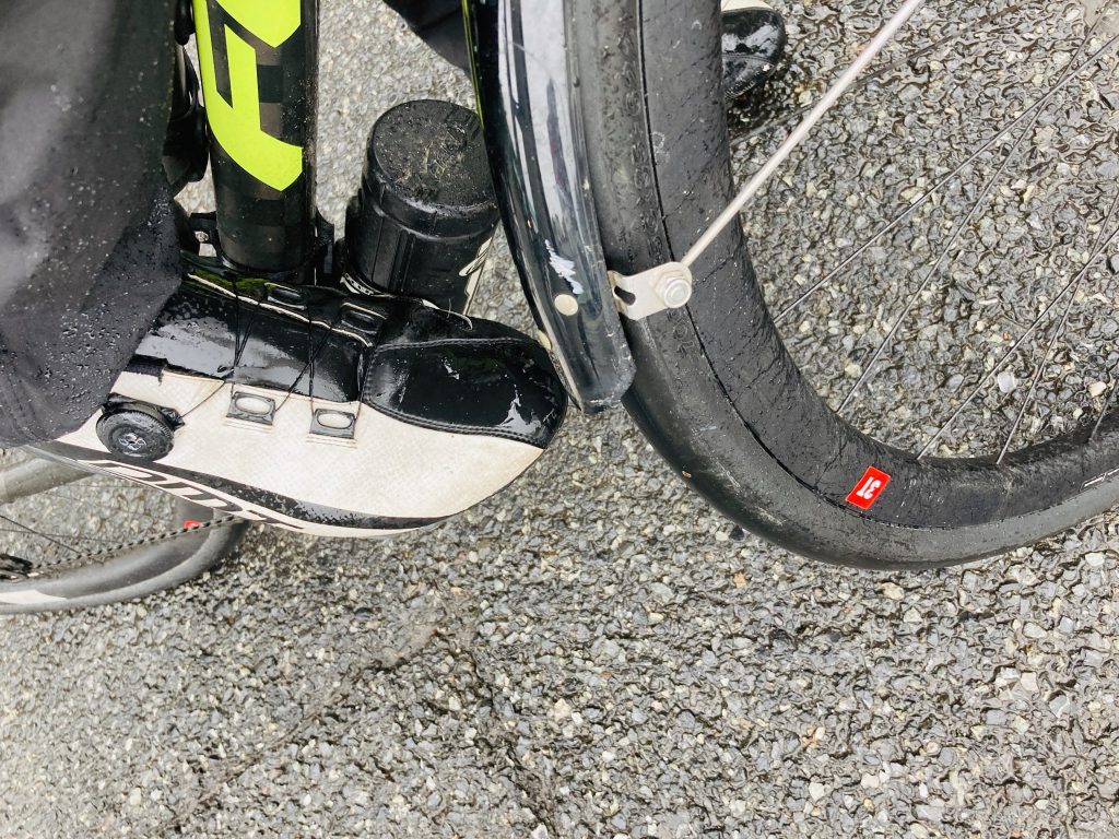 シューズカバー無しだと、前輪が巻き上げた地面の水と泥が靴にバシバシかかってきます。
