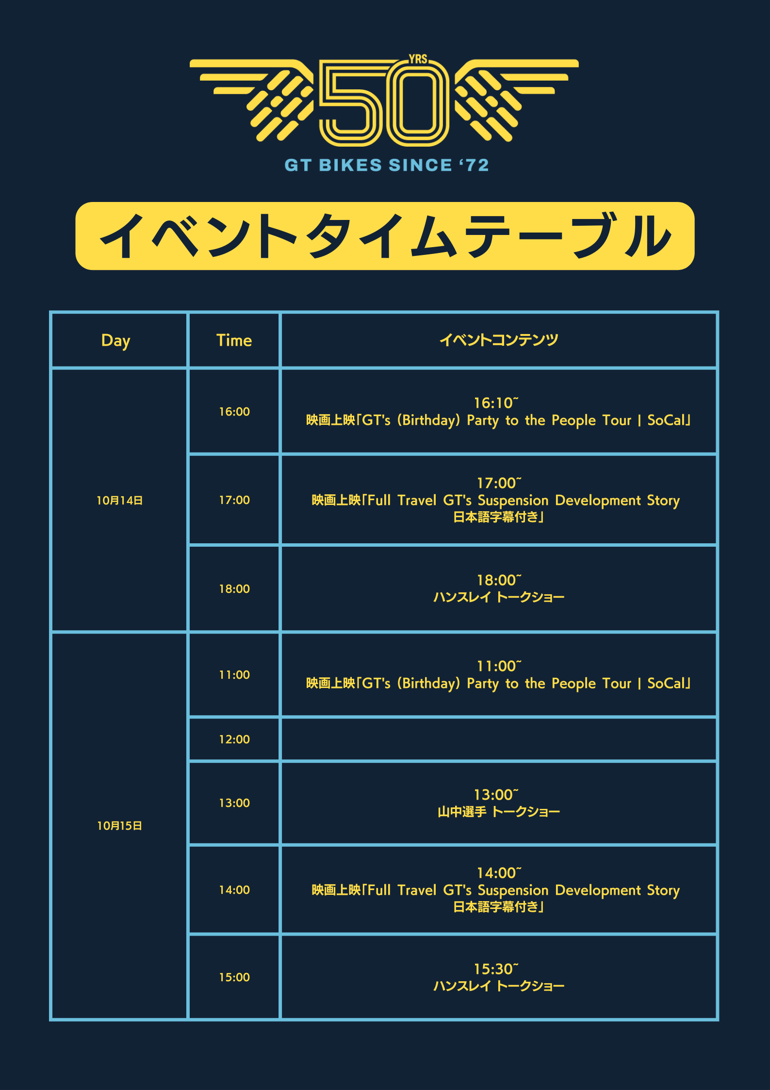 それから50年、GTはアメリカ西海岸のガレージブランドからMTB及びBMXカルチャーを代表するブランドの一つにまでなり、アメリカンバイクブランドのうち最も歴史あるメーカーのひとつとして世界中で広くスポーツファンにリスペクトされています。この節目の年に、GTはファンと共に50年の歴史を振り返り、その更なる飛躍を確かなものとするべくGT自らが主催の(バースデー)パーティを実施します。