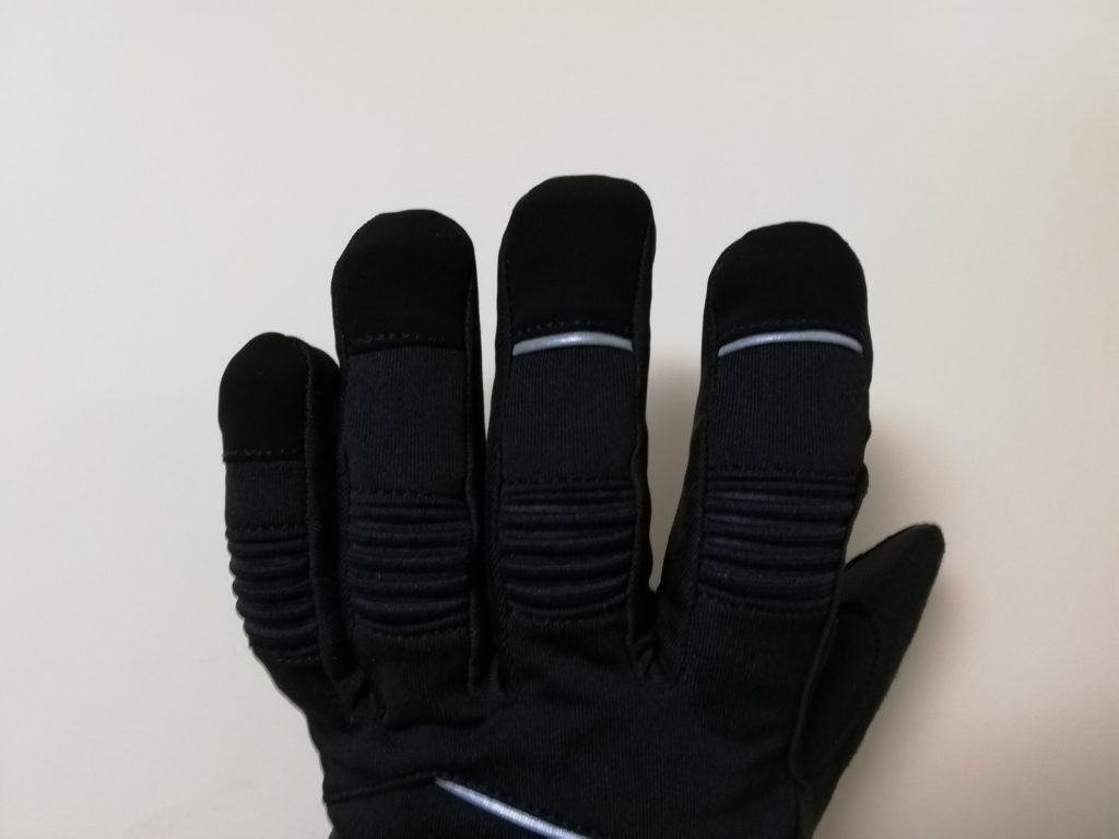 指先と手の甲に反射素材。冬は暗いので重要です。小さいですが、自動車のヘッドライトに反応して想像以上に目立ちます。