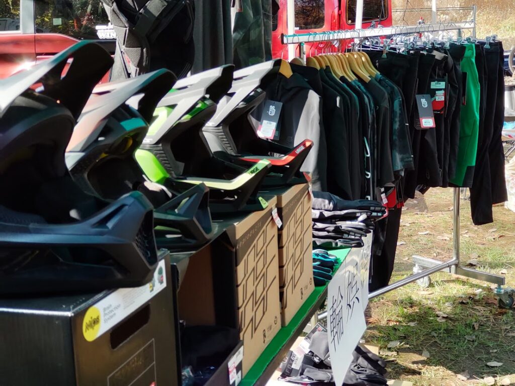 実は輪娯館様でもMTB専門のショップに改装したのは1年ほど前とのことでしたが、やはり走りやすいフィールドが身近にある環境ではMTB関連、特に下り系のパーツやアパレルのニーズが高いそうです。この日もウェアやヘルメット、ホイール等も販売され、出場ライダー達で賑わっていました。
