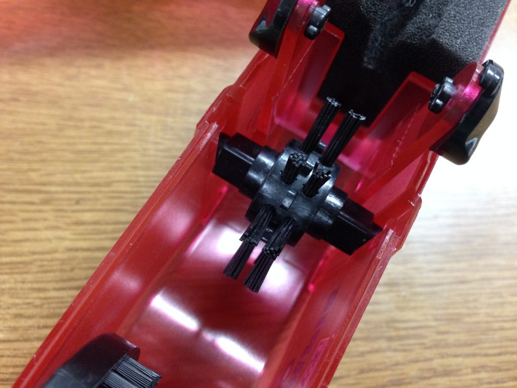 チェーンピッグには歯車は付いていません。ブラシ単体が回転する仕組みです。ということは、チェーンが通ると同じ向きにブラシが回るだけ。これではチェーンをなでるだけで、あまりきれいになる気がしません。