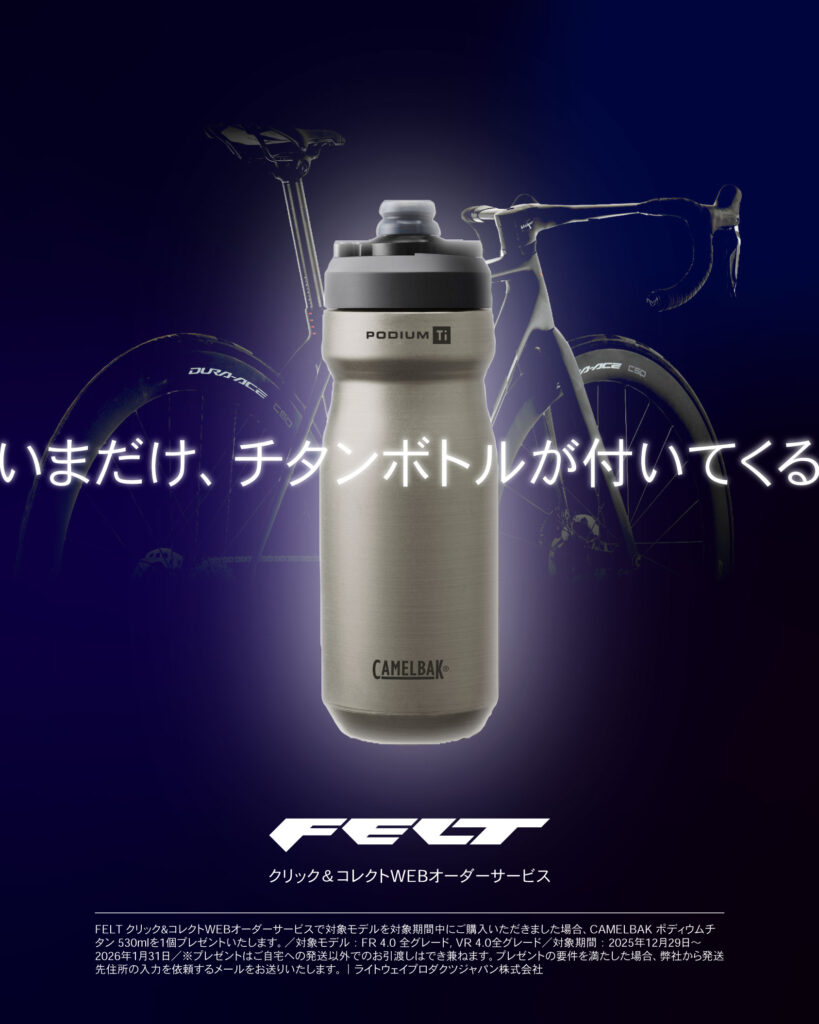 研究と実績によって裏打ちされた確かな技術力を強みとするロードバイクブランドFELT Bicycles(フェルトバイシクルズ/取扱い:ライトウェイプロダクツジャパン株式会社)は、2025年12月29日よりスマート購入サービス「FELTクリック&コレクト WEBオーダーサービス」にて対象モデルをご購入いただいた方に、サイクリング用のチタンボトル(2万円相当)をプレゼントするキャンペーンを開始いたします。