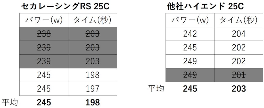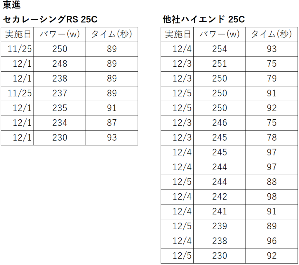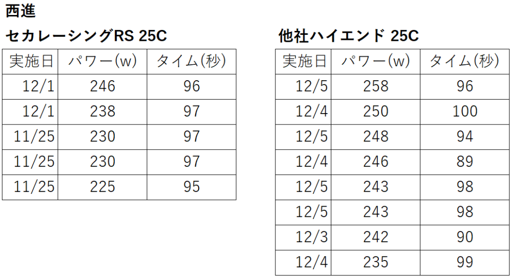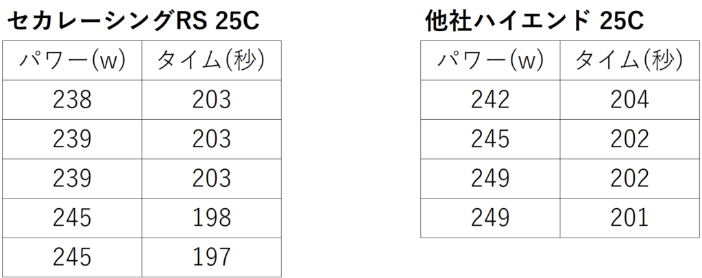 感覚的には両者で大きな差は感じませんでしたが、実際のタイムはセカレーシングRSが明らかに速くて驚きました。同パワーの場合、セカレーシングの方が速く、より低いパワーでも他社ハイエンドと同タイムが出ています。