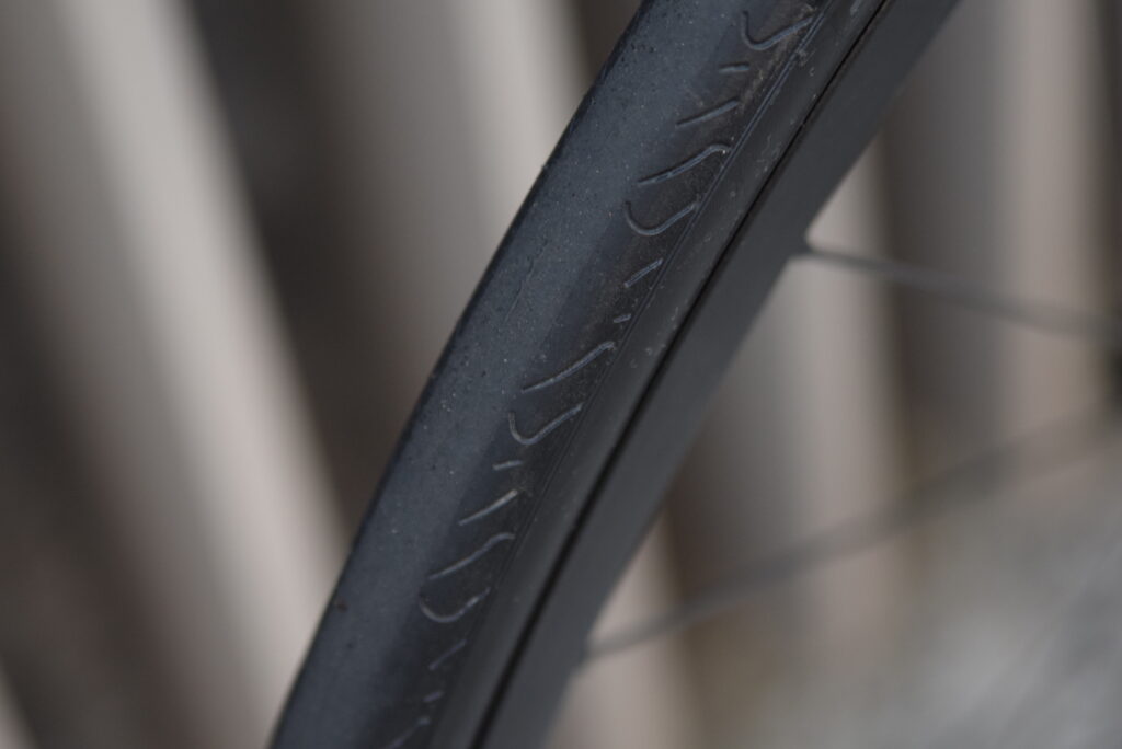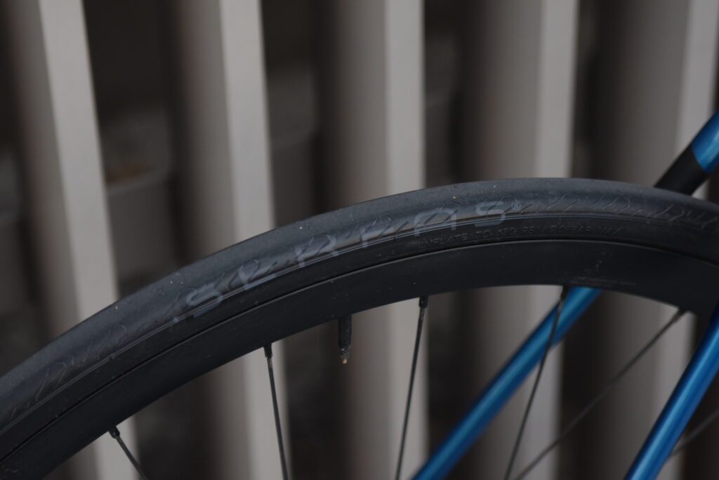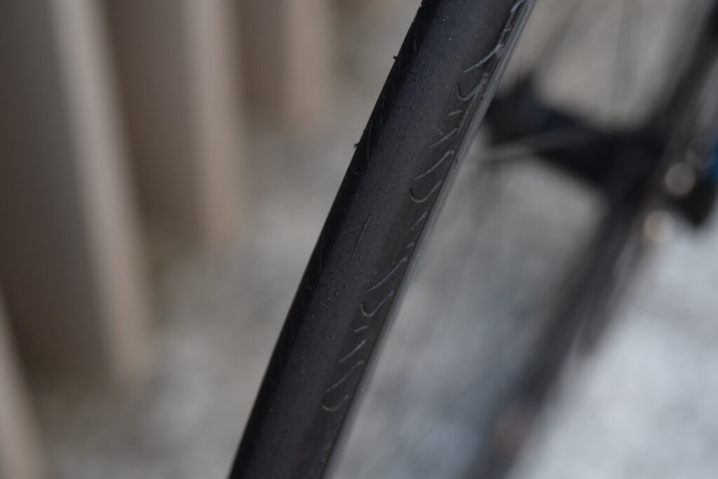 現在のところ335km使用しましたが、表面のカットや傷は入っていません。柔らかめのコンパウンドは傷が入りやすいことも多いですが、セカレーシングの場合はそういうことはありませんでした。タイヤ全体も剛性高めのしっかりとした造りで、耐パンクベルト「FPS」も入っているため、耐久性には信頼が置けます。接地面のタイヤ厚みが4〜5mmもあるので、使用できる距離にも期待できそうです。