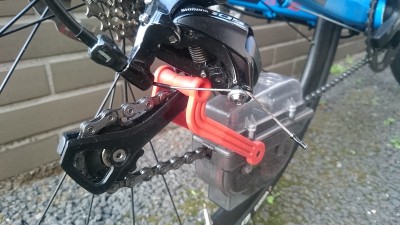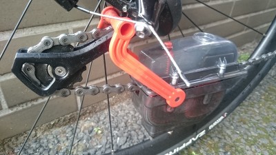上側のフタと下側の器でチェーンを挟んだら、赤いレバーを回して、リアディレイラーのゲージに引っかけます。