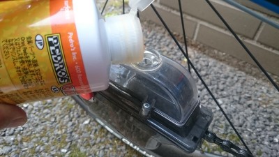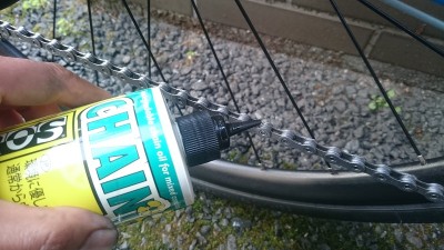 チェーンの水分が飛んで乾いたら、チェーンオイルをチェーンに注します。