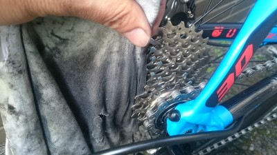 写真のようにボロ布を上下に動かせば、カセットスプロケットの汚れを拭き取れます。