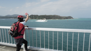名護から本部、海洋博公園と続く道は観光の名所で、交通量も多いらしく、片側2車線。 その上に立派な自転車専用の道路が延々と続いていて、日本全国こんなだったらなーーと思ってしまいました。 |
