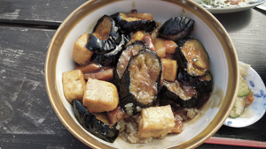 おかーさんの力作なす丼です。 これは沖縄料理というよりもおかーさんのオリジナルだそうです。とてもおいしかったです。 |