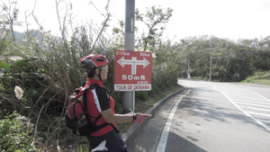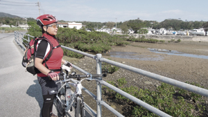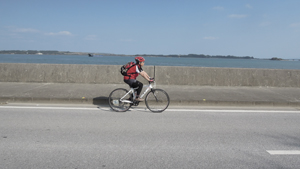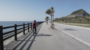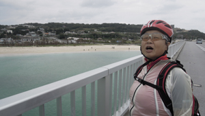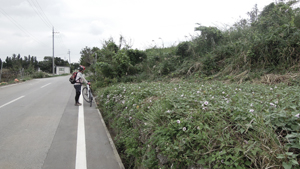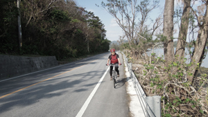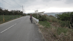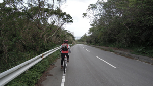 最終日、快晴。 これは真面目に走らなければと、この日は今帰仁、名護、本部、海洋博記念公園、一周およそ45kmのコースに出発です。 最初の登り、多少緊張していたかもしれません。 |