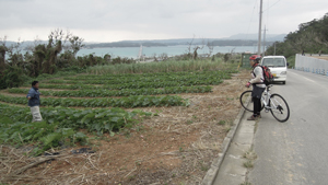 古宇利島でかぼちゃを作っている人と立ち話し。 遠くに古宇利大橋が写っているのですがわかりますか? ほぼ直線で、2kmもあるとても景色の良い橋です。 |
