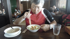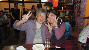さて、では沖縄の人。 辺野古近くの"かっか食堂"のご夫婦です。とても親切で、このお父さん、西海岸は比較的平坦だけど、東海岸は自転車では無理と教えてくれました。 おかーさんは「埼玉へ行ったことがある」から始まり、私に喋る隙も、食べる間も与えずに、喋り続けていました。 |