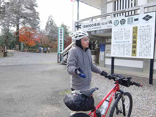 | 岡崎城から長篠城までは47km。 意外に運動不足のガーサスD。 登りはあまり無いと知り、安堵したのか逆にこの表情。 |