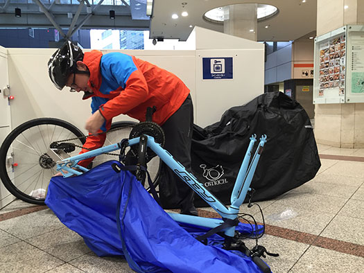 | スポーツバイク初心者のため、輪行も当然初めてです。 こうして初心者を巻き込んでいくことで、我々の企画もスポーツバイク振興に貢献しよう、というわけです。 |