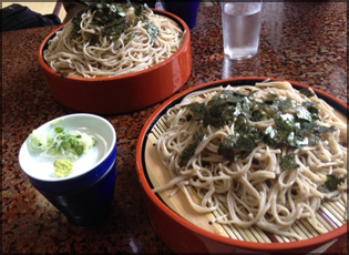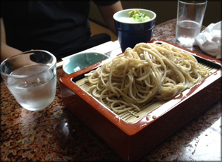 こちらでは水蕎麦という珍しいものがありました。露だけでなく、水、塩で食べるというもの。のぶさん曰く、水でもつるっといけるようです。 |