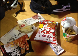 ヒルクライムレースでは頂上まで荷物を持って行ってくれることが多いのですが、お菓子を忍ばせておくと、頂上での待ち時間の時、非常に便利です。 お酒のおつまみっぽいものが多いのはご愛嬌! |