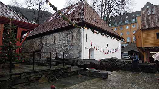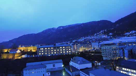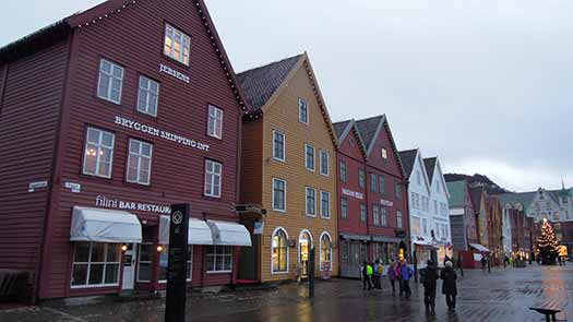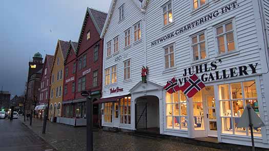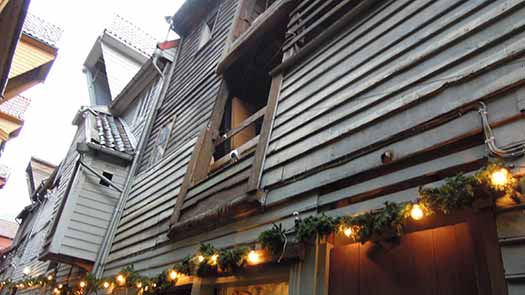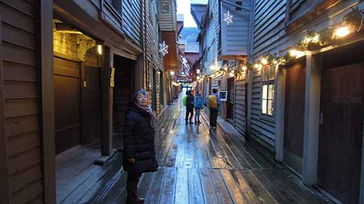 | ブリッゲンのある都市ベルゲンはおよそ北緯60°のあたりにあり、昼がとても短い町です。私達が行った12月は冬期で、朝10時になっても町の様子はまるで夕方です。 |