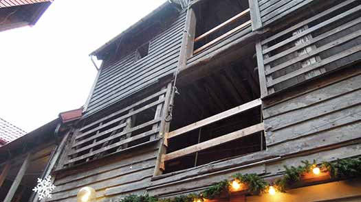 | 奥への通路を挟んで左右の建物が階段などで繁がっている所もありました。表の広さに対して税金がかかる制度でもあったのでしょうか? アムステルダムや京都のように。 |