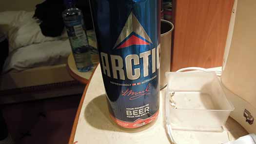 | ハイ、ハイ、今回も飲みました。でもちょっとです。これ、ノルウェー産北極ビールです。いくらだと思いますか ? スーパーで40クローネ、800円ぐらいするのです。 |